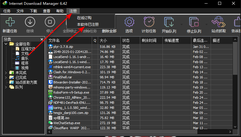 打开IDM,点击注册,看显示已注册,点击本软件已注册