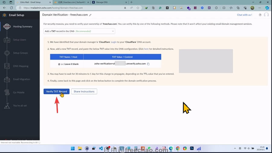 zoho会自动检测到我们的域名目前是在DNS解析在哪里的,在哪里就去哪里添加这条记录。比如cloudflare、阿里、namesilo、siteground等等