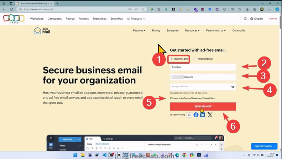 页面打开后,免费邮箱默认选择【Business Email】,这个就是企业域名邮箱,我们要注册的