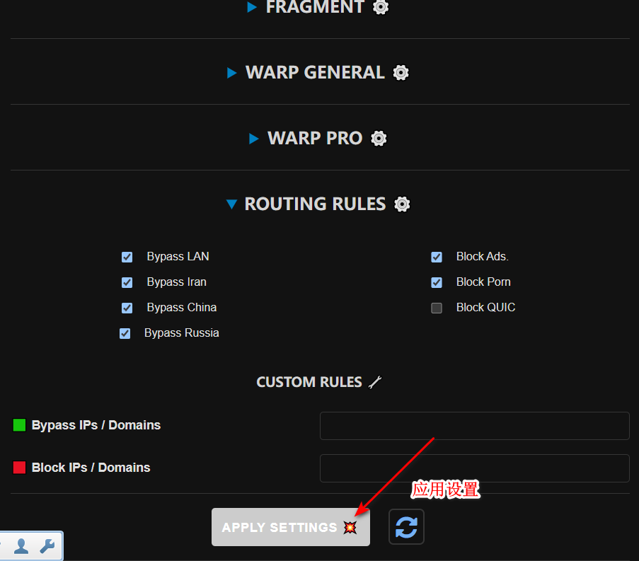 点击路由器规则:最后一个不勾,前面全勾上,点击应用设置