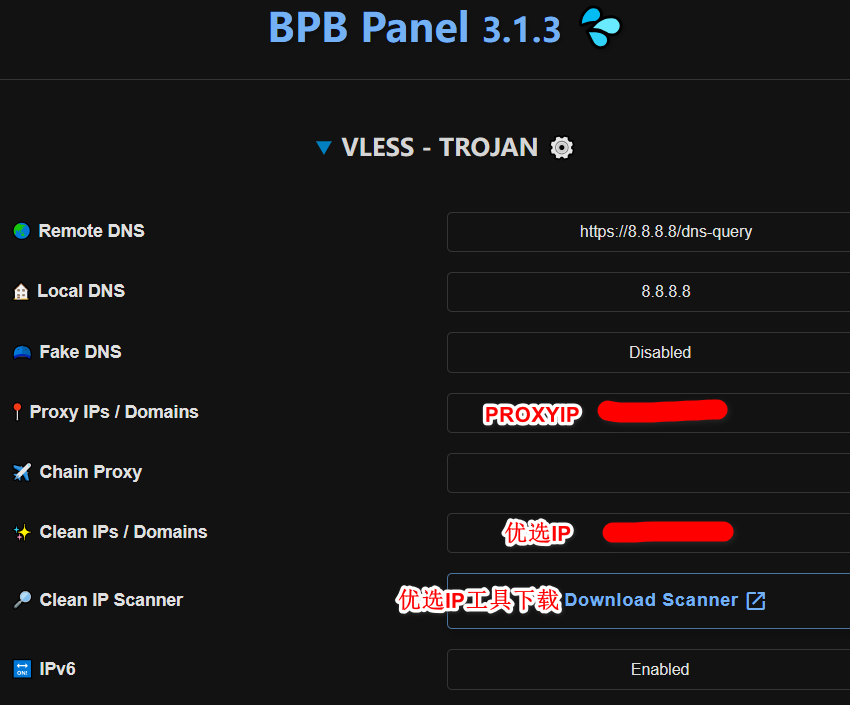 进入BPB面板后填入PROXYIP,Clean IP(优选IP工具,选Windows的下载,优选IP时关闭代理工具)