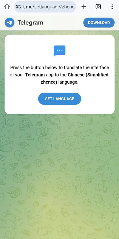 2、将以下链接复制到电报里的Saved Messages,并点击该链接;或者将链接复制到手机浏览器并访问,点击“SET LANGUAGE”